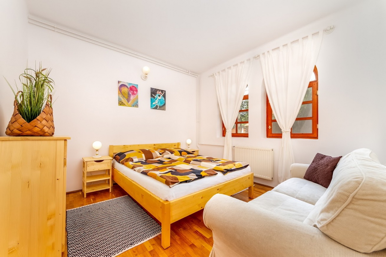 Földszint: Nappali főzősarokkal és étkezővel, fürdőszoba, WC, egy kétágyas szoba, terasz.